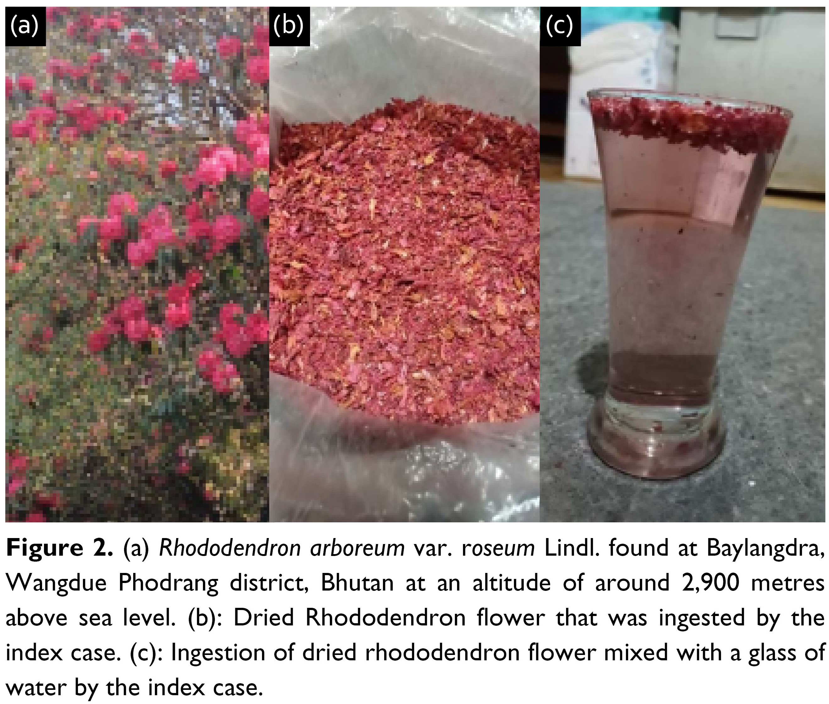 A 56-year-old female with no known comorbidities, who was residing at one of the temples in Baylangdra, Wangdue Phodrang was brought by ambulance to the emergency department of Wangdue Hospital with the complaint of persistent dizziness lasting 6 hours. She had an acute onset of dizziness following ingestion of a dried rhododendron flower of an amount of 50 – 100 g by mixing it with water and had three glasses of an amount of 600 mL. She had intentionally taken it to improve her indigestion issue after getting information from friends. She had other symptoms like nausea, anorexia, chest tightness, shortness of breath, and a tingling sensation in her limbs and face which all appeared 30 minutes after ingestion. She didn’t have vomiting, diarrhoea, seizure, and loss of consciousness. Because of persistent symptoms, she called Helpline 112, and she was picked up by an ambulance. At presentation, she had persistent dizziness, episodic chest tightness, and shortness of breath.